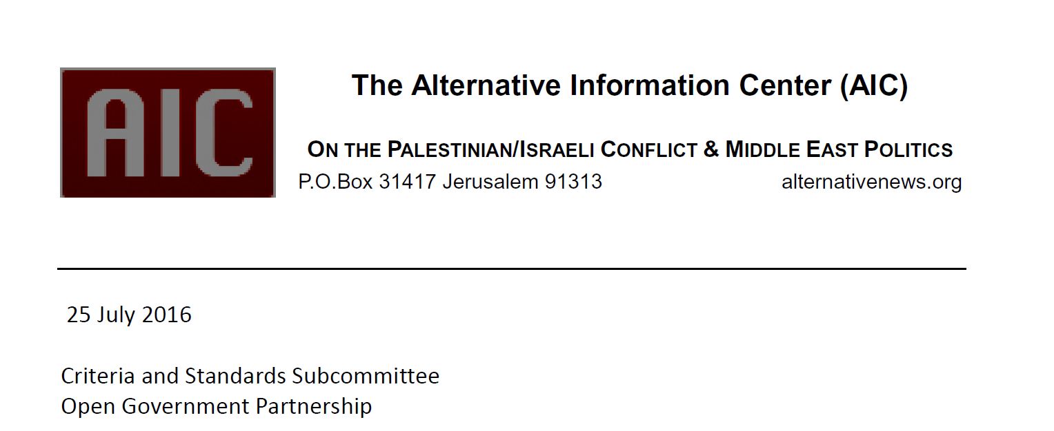 The Alternative Information Center (AIC) is writing to express concern that the state of Israel is seemingly acting in a manner that undermines the values of the Open Government Partnership (OGP) and to request that an inquiry be initiated in this matter. The AIC is concerned that Israel is violating its commitment to “protecting the ability of not-for-profit and civil society organisations to operate in ways consistent with our commitment to freedom of expression, association and opinion”. This commitment is enshrined in the Open Government Declaration which Israel accepted upon joining the OGP .